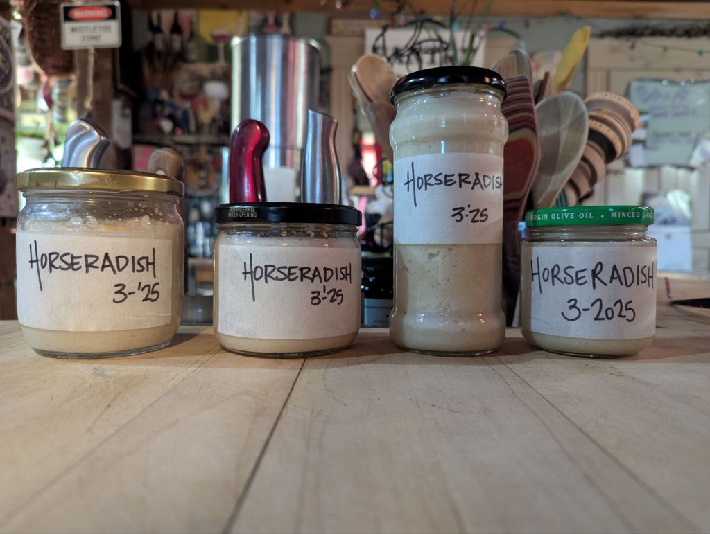 The trick is to get really good at holding your breath and working with your eyes closed. That absolutely helps. I practiced this maneuver and hyperventilated when I would periodically escape to the side porch. Got rather good at it, too. Grating, stirring, **one blink check** barrel down pulsate, exhale, drop the towel, …run. side porch exhale, shallow breathing to restore lung function, then a lather-rinse-repeat to the final product. *Boom, freshly ground horseradish!